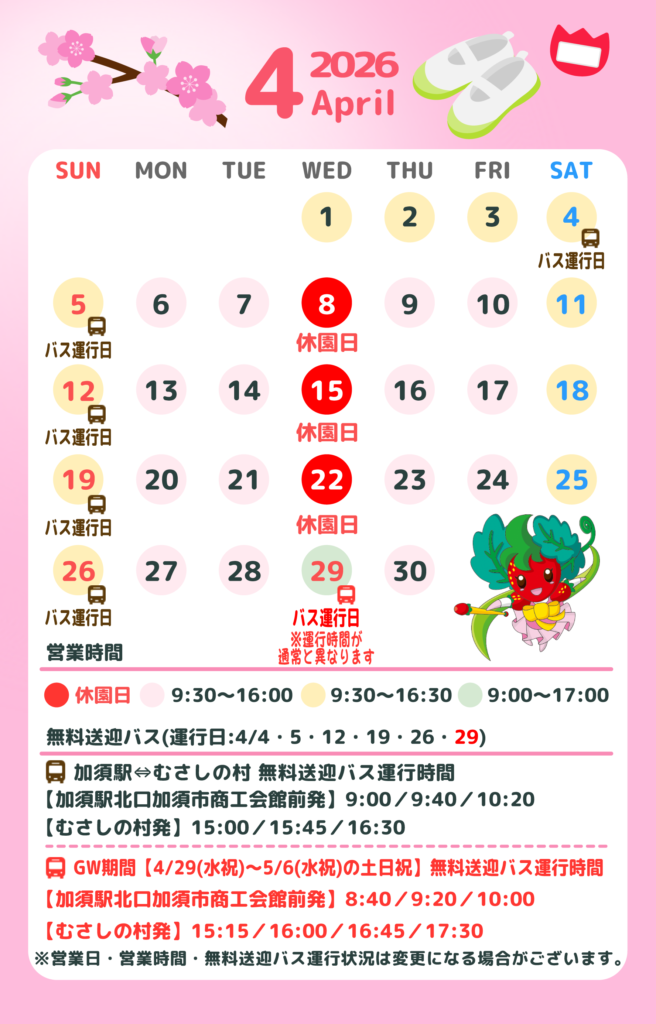 【4月】むさしの村 無料送迎バス運行日のお知らせ