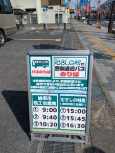 3月より、むさしの村の無料送迎バスの発着所が、加須市物産観光協会前に変更になっております!加須駅北口徒歩3分。送迎バス運行日には看板を出してお待ちしております。