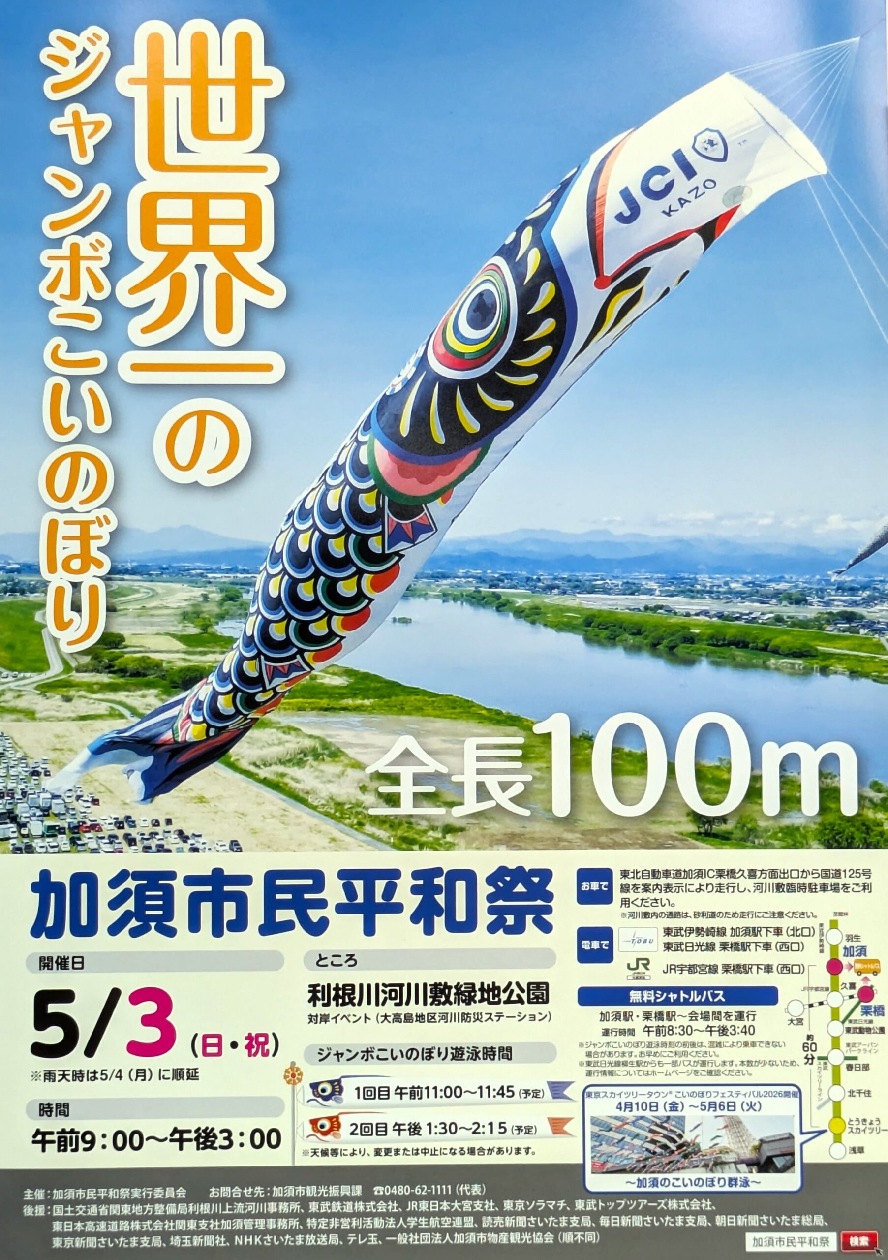 世界一のジャンボこいのぼりを見よう🎏✨ 市民平和祭は、世界一大きい全長100mのジャンボこいのぼりの遊泳やステージショーなど、多彩な催しものでにぎわう、市民の平和への願いをこめた祭典です。 【イベント概要】 … 続きを読む 【5月3日】第17回 加須市民平和祭開催!~ジャンボこいのぼり遊泳~