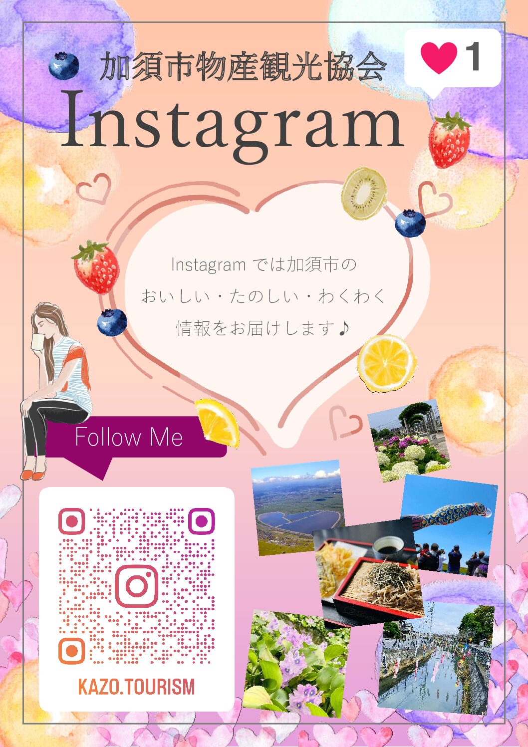 この度、加須市物産観光協会の公式Instagramを開設しました! 加須市の人気観光スポットやイベント、グルメなどの HOTで楽しい情報を皆さまにお届けします♪ 是非フォローよろしくお願いいたします! アカウントはQRコードから読み取り、または 「kazo.tourism」「加須市物産観光協会」で検